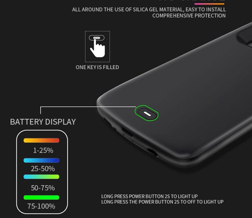 4. Put the phone on the back clip battery, please slowly insert the back clip charging connector, press the back clip charging switch once, start charging the phone, press the switch again to turn off the charging mode!