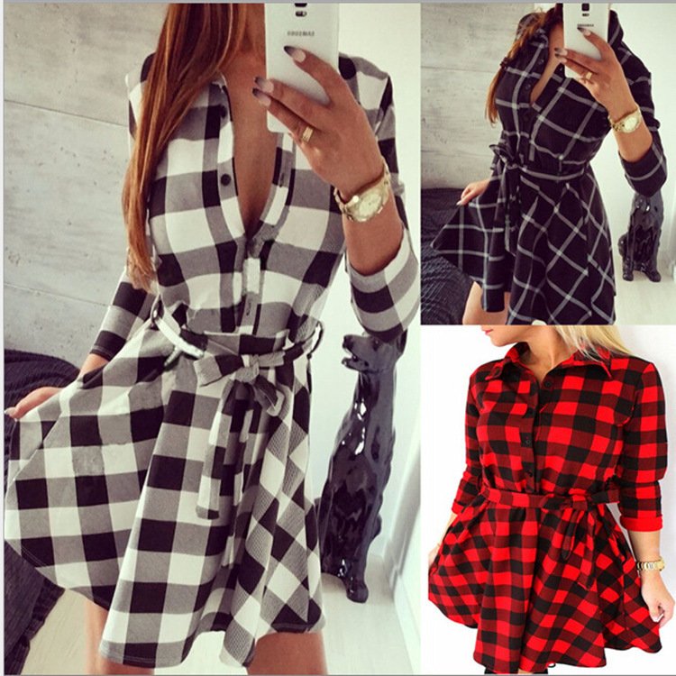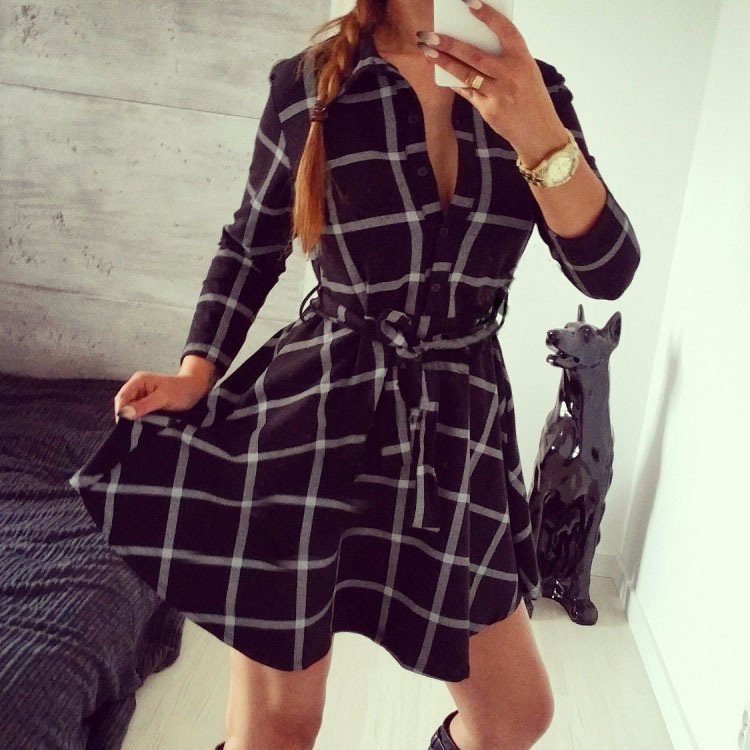 Black And White Plaid Cropped Sleeves Bandage Shirt Dress