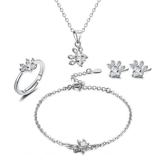 New Fashion Cat Bear Dog Paw Ring for Women Jewelry Sets White CZ Stone Silver Gold Rings Necklace Bracelet Earring Set
